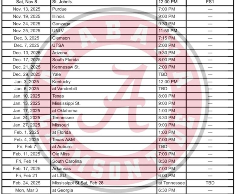 Le calendrier de basket-ball de l’Alabama 2025-26 est désormais défini. L’Alabama débute la saison régulière le 3 novembre. Veuillez noter que, sur la base de l’accord de la SEC avec ESPN, vous pouvez vous attendre à voir la plupart des matchs sur l’un des réseaux de la famille ESPN cette saison (ESPN+, ESPNU, ESPN2, ESPN et ABC). Vérifiez toujours votre liste locale avant de planifier définitivement le match.