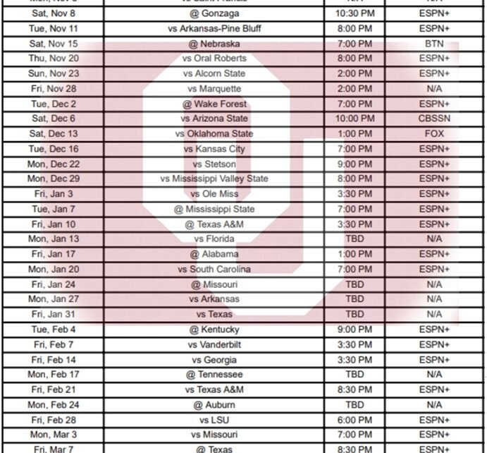 Le calendrier de basket-ball de l’Oklahoma 2025-26 est désormais défini. L’Oklahoma débute la saison régulière le 3 novembre. Veuillez noter que, sur la base de l’accord de la SEC avec ESPN, vous pouvez vous attendre à voir la plupart des matchs sur l’un des réseaux de la famille ESPN cette saison (ESPN+, ESPNU, ESPN2, ESPN et ABC). Vérifiez toujours votre liste locale avant de planifier définitivement le match.