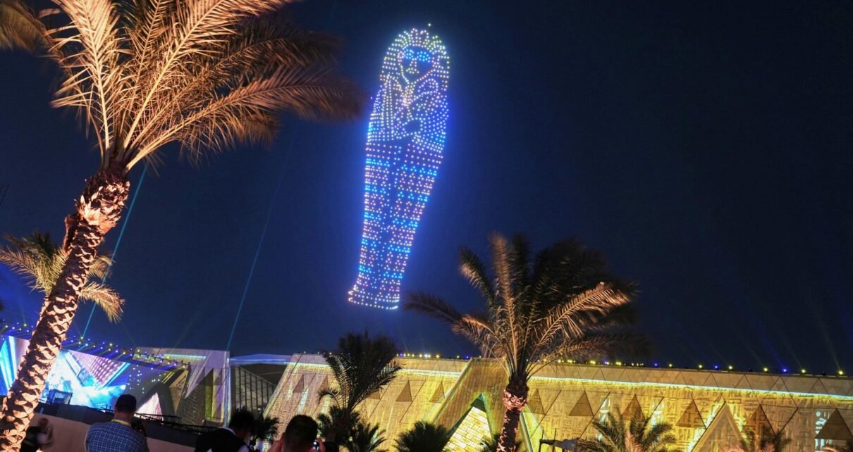 La ceremonia de inauguración incluyó fuegos artificiales y un espectáculo de luces con drones que representan dioses antiguos y pirámides en el cielo.