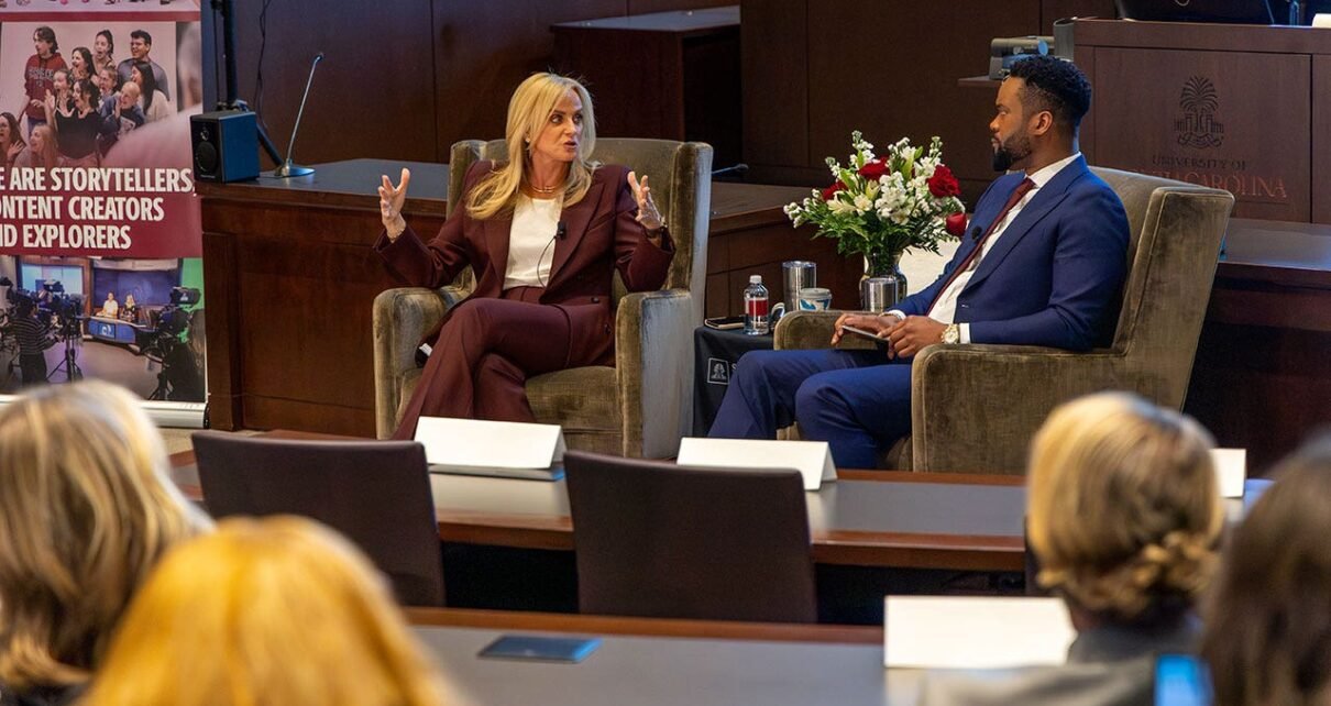 A CEO da FOX News Media, Suzanne Scott, e o apresentador de “FOX & Friends” Lawrence Jones na série de palestras Baldwin Business and Financial Journalism da Universidade da Carolina do Sul. (Mídia FOX News)