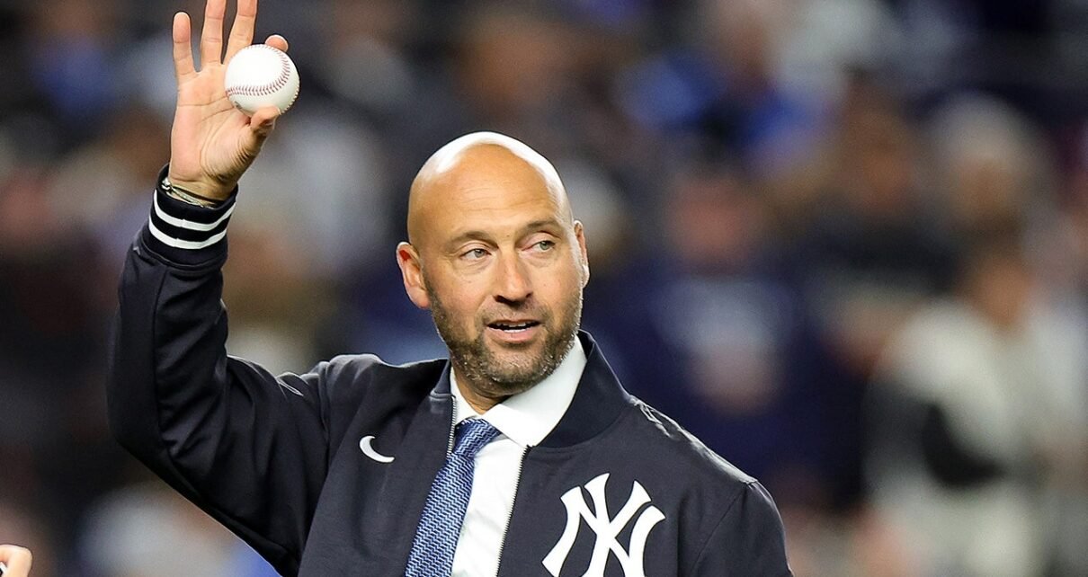 O membro do Hall da Fama do Beisebol, Derek Jeter, acena para os fãs no Yankee Stadium em 28 de outubro de 2024. (Alex Slitz/Imagens Getty)