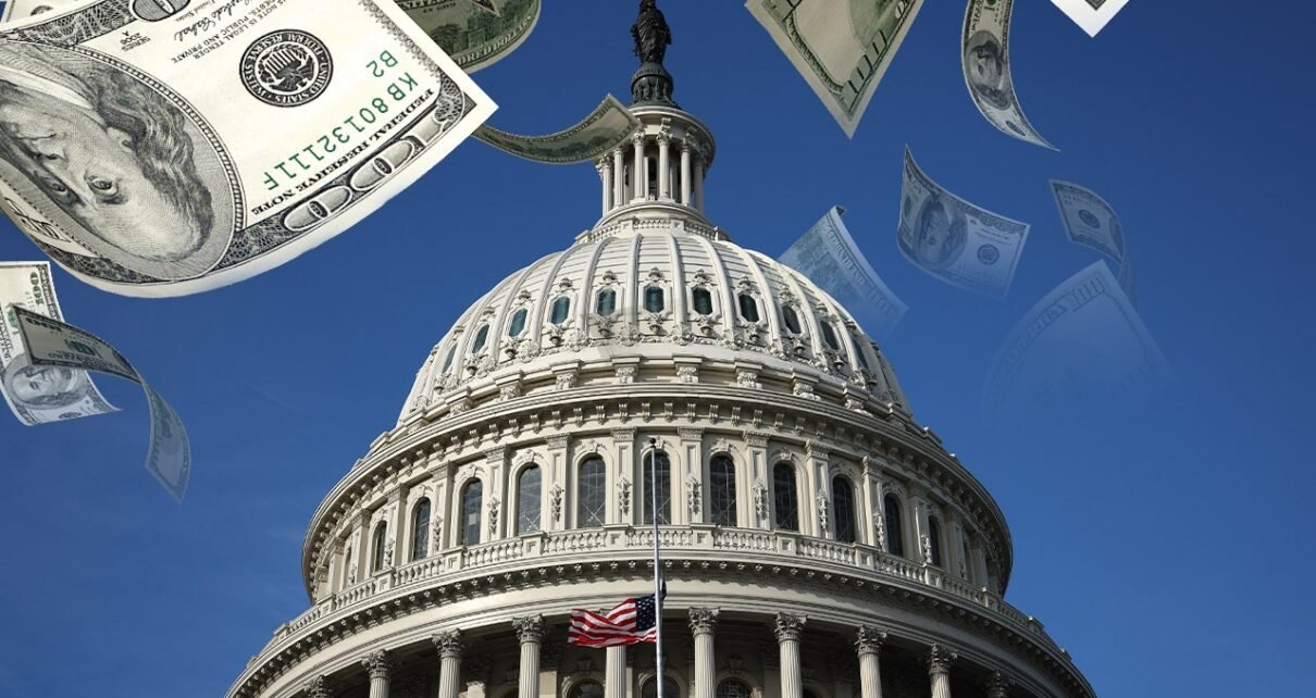 Uma foto do edifício do Capitólio dos EUA em Washington DC cercado por moedas caindo. (Foto: Win McNamee/Getty Images)